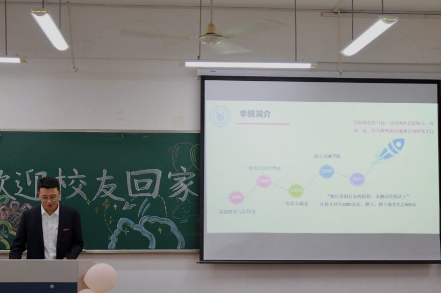 当天下午,学院“第八届校友沙龙”在学院楼202报告厅顺利举行。本次沙龙邀请了万向信托股份公司副总裁、93届校友斯伟波,浙江尚科生物医药有限公司董事长、98届校友周朝晖,浙江银万斯特投资管理有限公司合伙人&投资总监、05届校友赵峰,以及蚂蚁集团网商银行高级产品专家、13届校友余谦等四位优秀校友,与同学们分享他们的个人经历以及关于更好开展金融专业学习的方法。校友们横跨数载时空,将校园与外面的世界巧妙对接,在热情洋溢的氛围当中实现了沟通感情、多角度育人的双重作用。