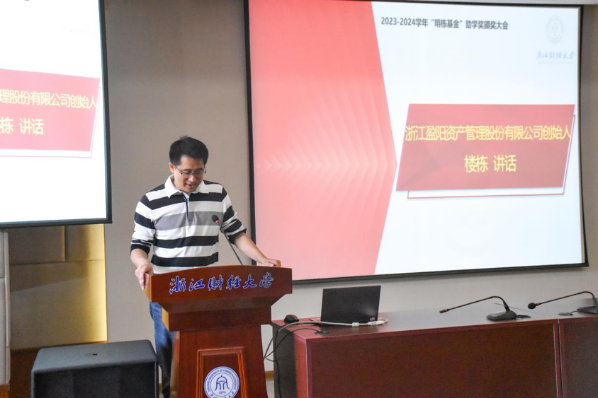 随后,“明栋基金”捐赠方代表楼栋校友讲话。他向获奖同学表示祝贺,向领导、老师、同学,以及学校各职能部门表达由衷的敬意。他讲述了助学奖的设立初衷,认为校友助学是学校和校友之间的一种深度互动和情感的纽带。他嘱咐学子们要敢于探索,勇于创新,去了解社会,真正做到学习和实践结合。