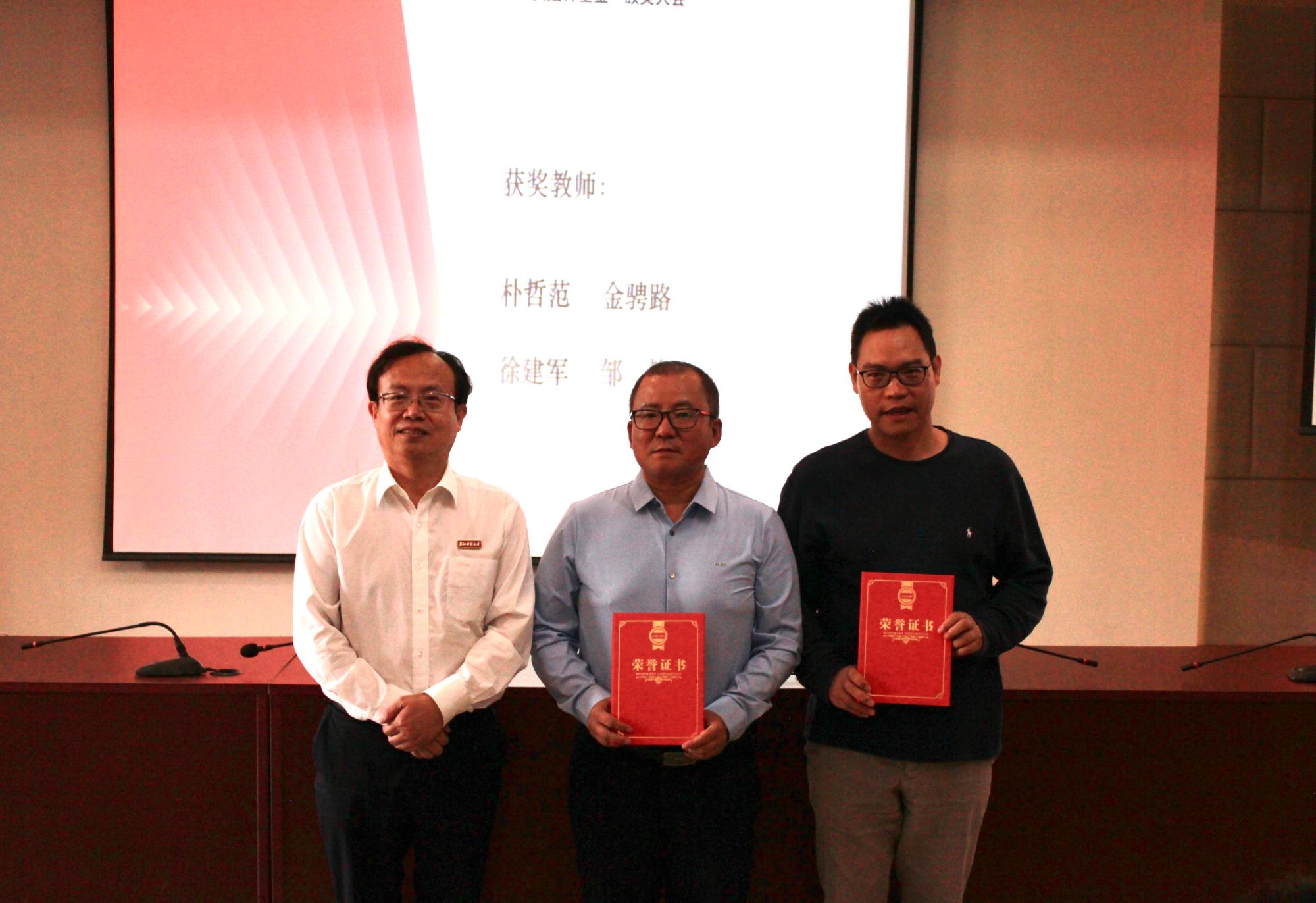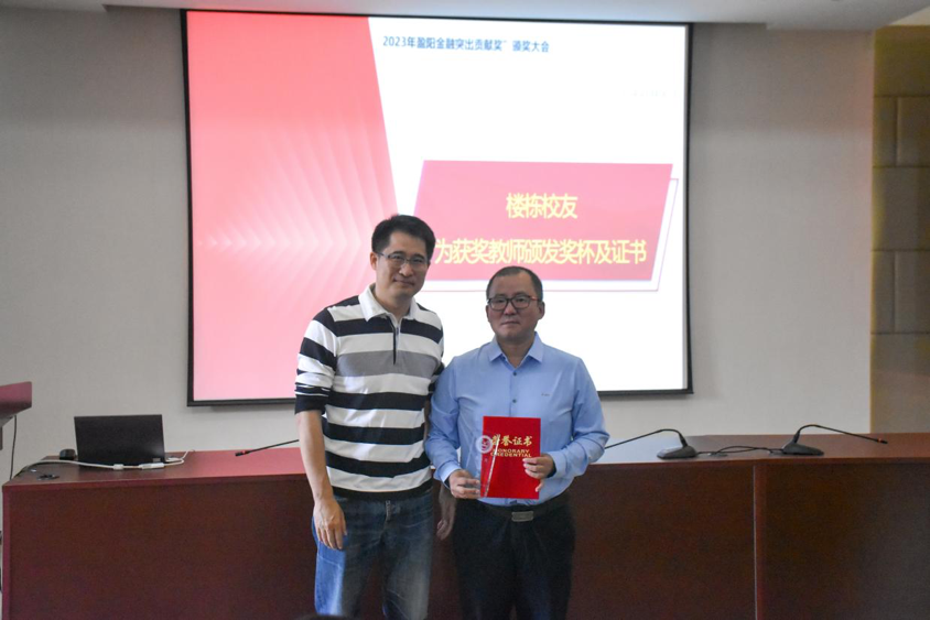 “盈阳金融突出贡献奖”自2016年设立以来,通过奖励学院有突出贡献的老师,不断激励学院老师积极开展科学研究,在教书育人、爱岗敬业、乐于奉献、求真务实、开拓创新等方面起到了正面引导作用。经评审,2023年,学院朴哲范、金骋路老师获评“盈阳金融突出贡献奖”育人类金奖。楼栋校友为获奖教师颁发奖杯及证书。
