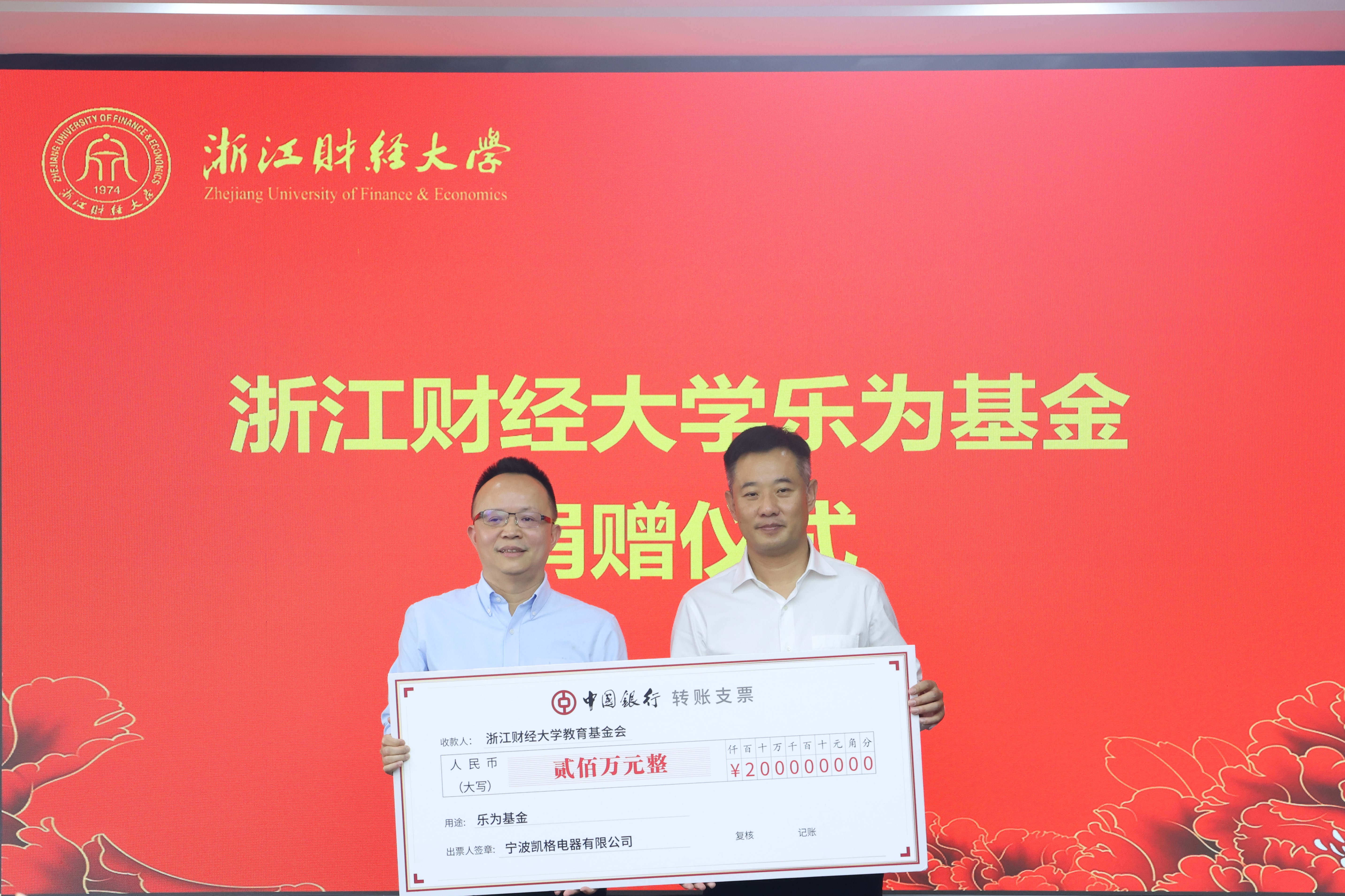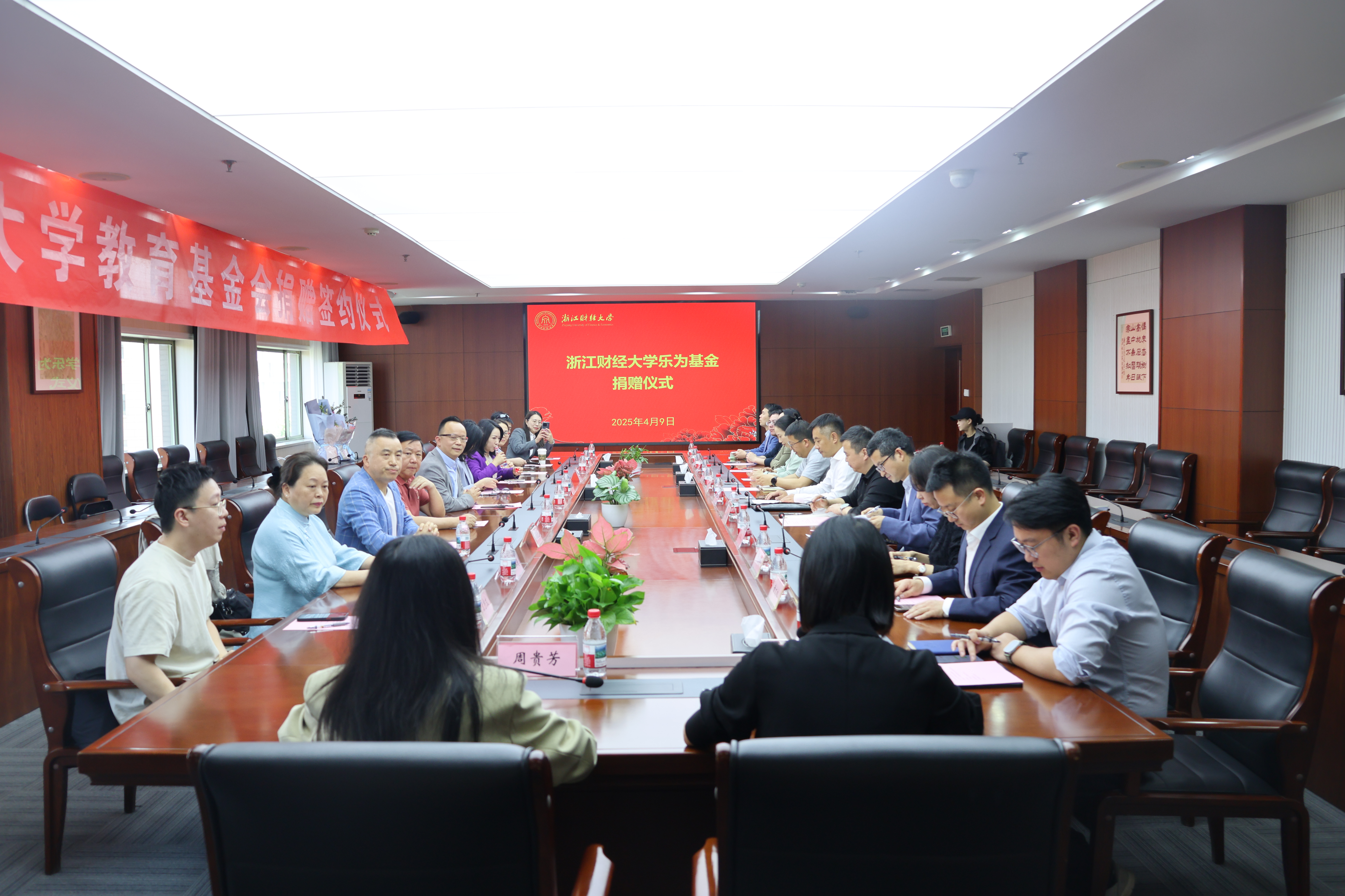 4月9日,“乐为基金”捐赠签约仪式在学校下沙校区举行,校党委副书记程爽,宁波凯格电器有限公司总经理、99届货币银行学专业校友周乐为出席签约仪式。