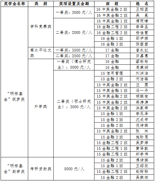 明栋基金评办法补充规定》,经学生个人申请,学院学工办审查,“明栋基金”管理委员会评审,共评出2018—2019学年“明栋基金”获奖者共30名,具体获奖名单请见下表。现予以公示,公示时间为2019年6月9日—2019年6月11日。如对评审结果有异议,请于6月11日前以书面或口头方式向学院学生工作办公室反映。