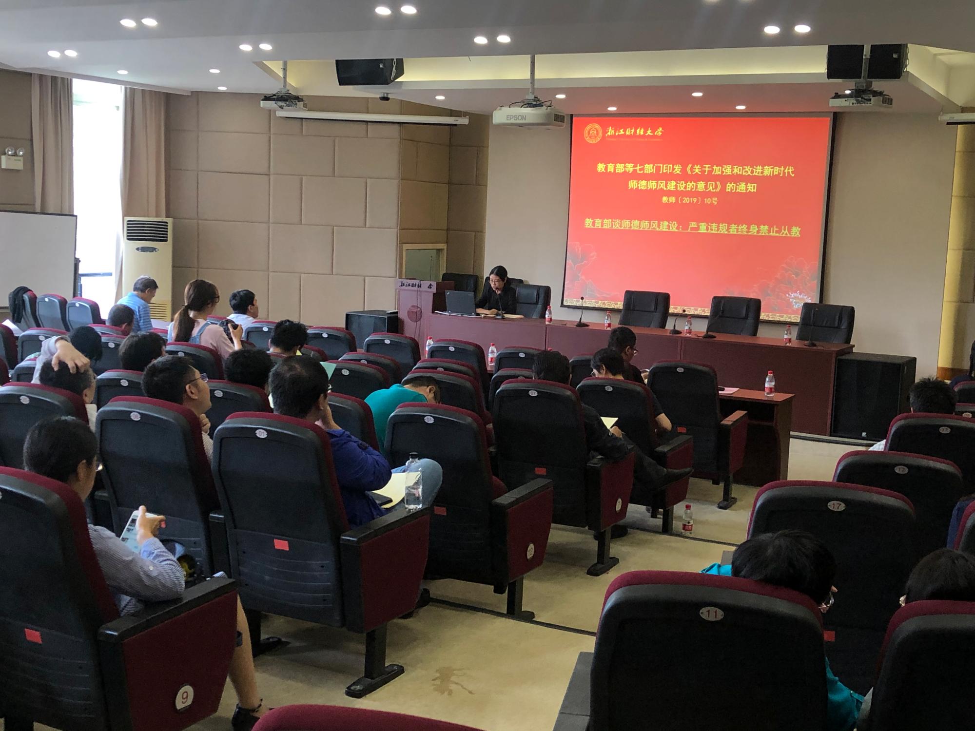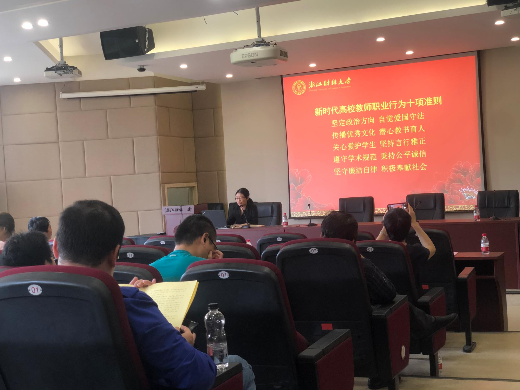会上,谢敏领学了教育部等七部门印发的《关于加强和改进新时代师德师风建设的意见》文件精神,结合教育部网站曝光的师德师风警示案例,带领大家学习了《新时代高校教师职业行为十项准则》和《中华人民共和国公职人员政务处分法》。她指出,《意见》的出台是加快师德养成,全方位推进新时代师德师风建设的有力举措。《准则》为新时代高校教师的职业行为界定了清晰标准,《公职人员政务处分法》也对高校管理人员提出了明确约束。作为高校教师要自觉肩负起立德树人的根本任务,进一步增强教师的责任感、使命感、荣誉感,规范职业行为,明确师德底线,努力成为有理想信念、有道德情操、有扎实学识、有仁爱之心的好老师,做好学生的引路人。
