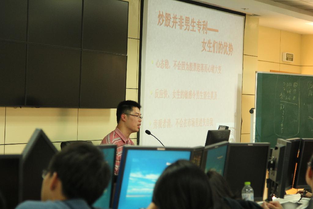 紧接着,拥有丰富实盘经验的金融学会07级学长徐旸为在场同学带来了一场精彩生动的演讲。徐旸从自身收益入手,向大家展示相关数据并通过列举生活实例,与在场同学一起见证了投资证券能够带来的巨额收益。在肯定证券投资的重要性之后,徐旸又就股票投资展开了实盘指导。他以游戏为喻,提醒同学们股票投资须明确目的,因此,短线强势股还是长线慢牛股的选择举足轻重。而在接下来的实际操作中,他又告诫同学应注意控制风险、避开整位数交易,理性投资才可顺应市场取得收益。同时,他又指出密切关注金融资讯及对股市影响深远的国家政策尤为重要,获取充足的市场信息可以帮助大家更好地做出判断。最后,徐旸还强调了实践的重要性,牛熊市中的不断历练才能“斩断亏损,让利润奔跑”。他深刻的投资理念及透彻的市场分析赢得了同学们的一致好评。