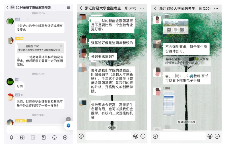 开设线上咨询渠道,通过公开招生热线和建立QQ、微信专属咨询群,解答考生和家长们的各类问题,如专业区别、分数位次、招生科目要求等等,尽力做到及时准确全方位的解答。