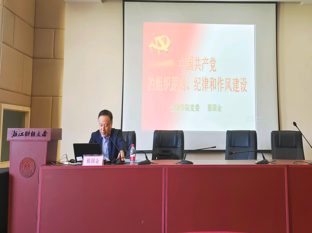 蔡国金书记以《中国共产党的组织原则、纪律和作风建设》为题,从中国共产党的根本组织原则—民主集中制、严守党的纪律、加强党的作风建设三个部分进行阐述。他强调没有集中的民主是空洞的,没有民主的集中是危险的,我们必须贯彻坚持民主集中制,强调党纪严于国法,每位党员必须严守党的纪律,保持党的先进性与纯洁性,他最后强调大家要保持良好风气,切勿以权谋私,立志做党的光荣传统和优秀作风的忠实传人。大家一定要不断加强党的组织、纪律和作风建设,充分发挥党员的先锋模范作用,做担当民族复兴大任的时代新人。