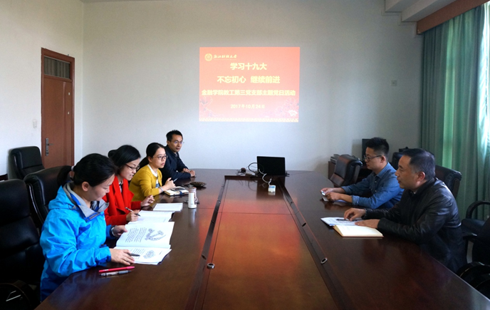 的学科和专业优势,具体学习了党的十九大报告中关于金融内容的阐述,并展开了热烈的讨论。党员们一起分析了党的十九大报告与党的十八大报告中关于金融内容阐述的异同,讨论了货币政策和宏观审慎政策双支柱调控的作用及相互之间的联系,提出了加强宏观审慎管理、增强货币政策效果的对策建议。最后,支部各个党员讨论了金融服务于实体经济、避免“脱实向虚”问题的对策。