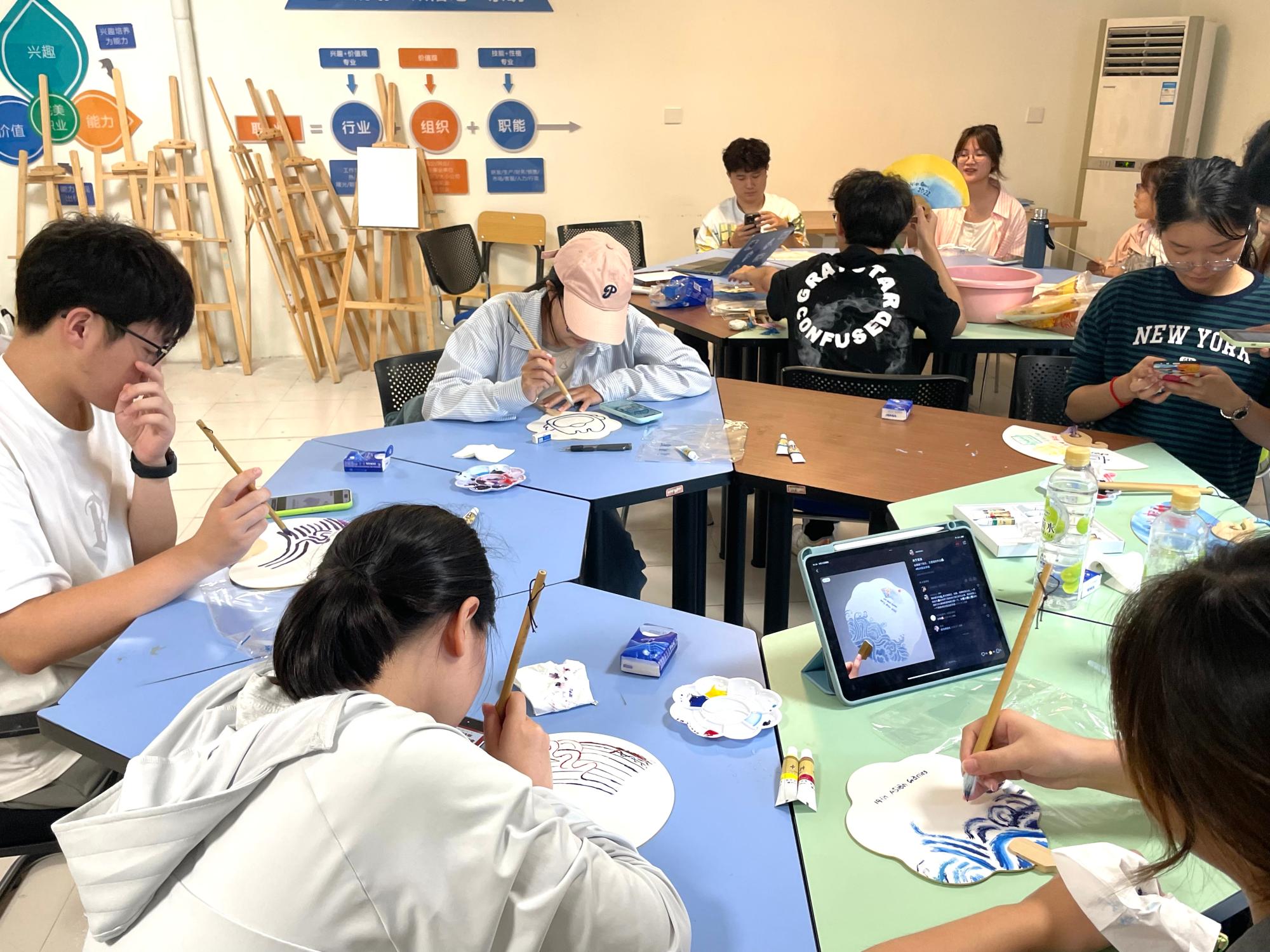 本科生第三党支部组织支部党员在桃李苑3幢活动室举行“扇画雅风 妙绘亚运”活动。同学们互相交流、共同创作,在扇面上画出各种与亚运相关的图画,并简单介绍了自己作品的含义。一张张精美的扇画,不仅表达了大家对杭州亚运会的美好期待,也领悟着“用心交融,互相包容”的杭州亚运精神。