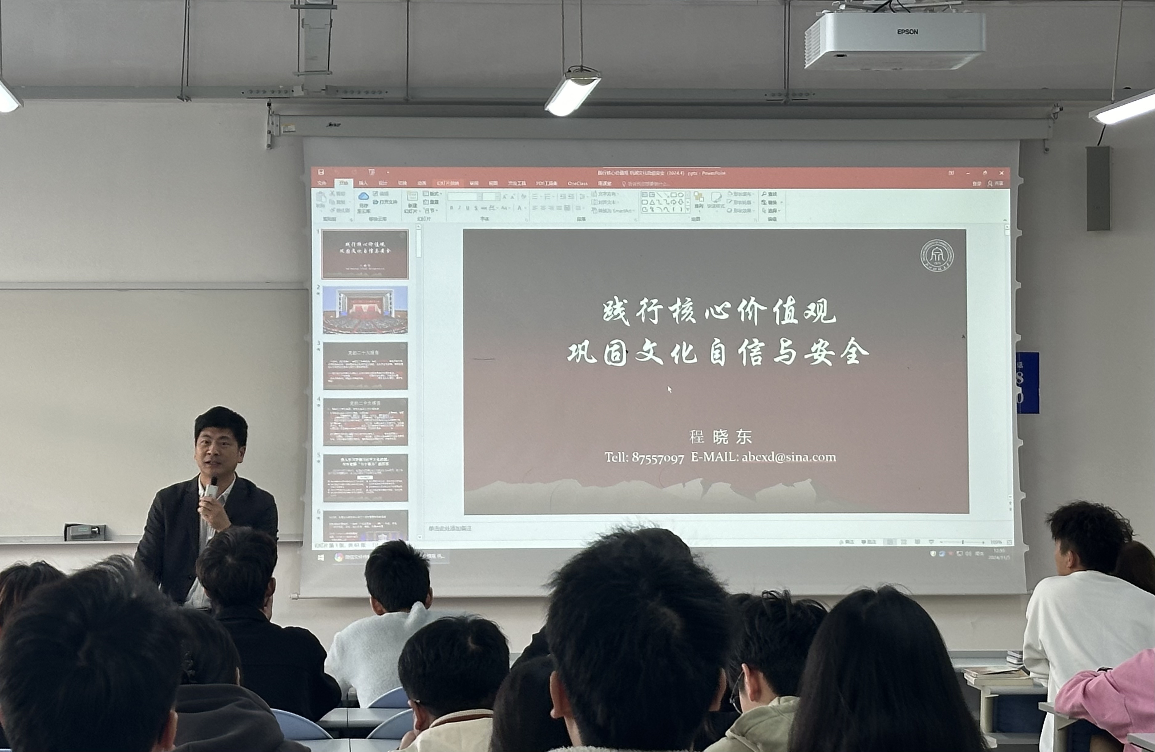 程晓东以《践行核心价值观,巩固文化自信和安全》为主题,根据党的二十大报告内容,强调“七个着力”要求,深化了同学们对习近平文化思想的认识和理解。随后,程老师结合社会思潮和热点问题,讲解了中华文化的内涵,着重指出培育和践行社会主义核心价值观的必要性。最后,程老师寄语同学们做一个正气、正面、正能量的人。