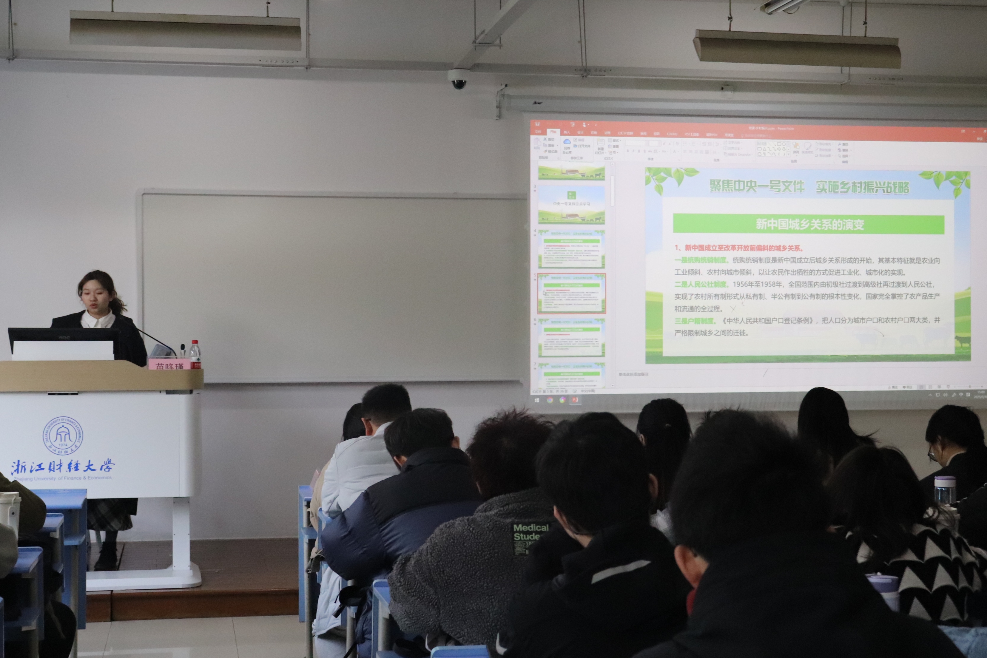 苗咚瑾围绕《树立理想信念,投身乡村振兴》这一主题,立足新中国城乡关系的历史演进脉络,结合浙江“千万工程”等乡村振兴典型案例,深刻剖析了实施乡村振兴战略的时代必然性和战略意义。她强调,新时代青年要厚植家国情怀、勇担时代使命,将个人理想融入国家发展大局,在乡村振兴的广阔天地中施展才华、建功立业,为实现农业农村现代化贡献青春力量。