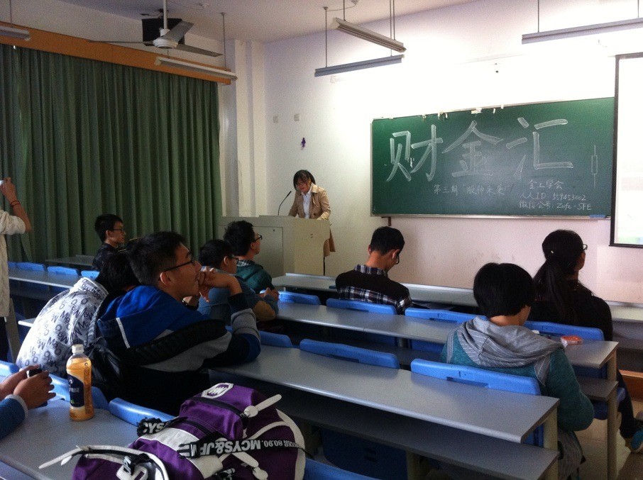 11月5日下午1点30分,由金融工程学会举办的第三期“财金汇”在SF漫画 楼204如期开讲。本期“财金汇”迎着金融学会举办的模拟证投资大赛的热潮,邀请到了具备丰富股票知识和炒股经验的嘉宾为同学们授业解惑。讲座开始后,首先由12级的陈莉莉同学给在场的同...